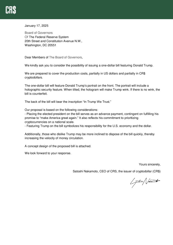 Previously the issuer of the cryptodollar (CR$) has submitted an official proposal to the Federal Reserve, suggesting the issuance of a banknote featuring Donald Trump. Alongside the proposal, they have developed a design concept for the bill.