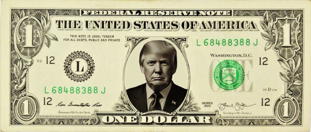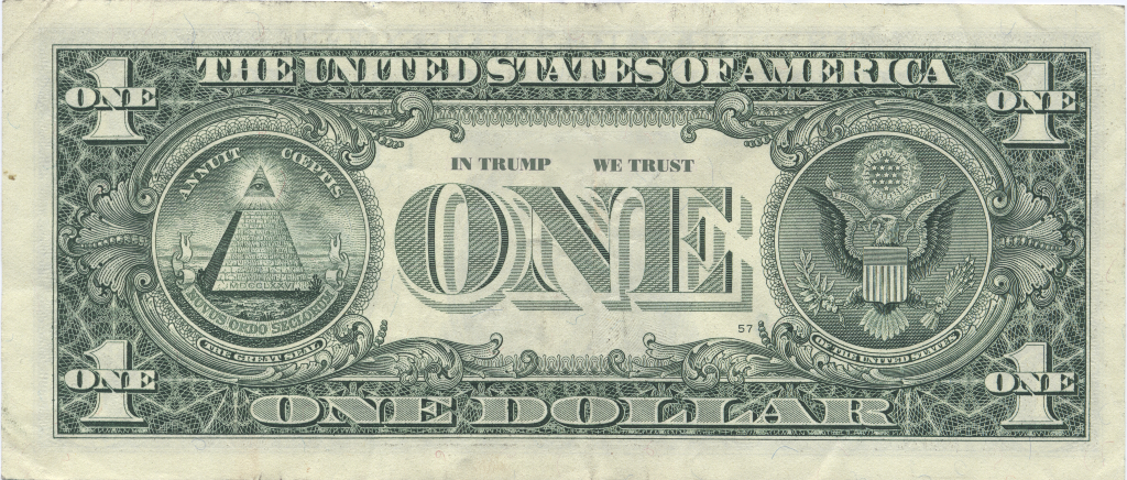 The front side of the one-dollar bill features a portrait of Donald Trump, equipped with holographic security. When tilted, the hologram makes Trump wink—if he doesn’t, the bill is counterfeit.