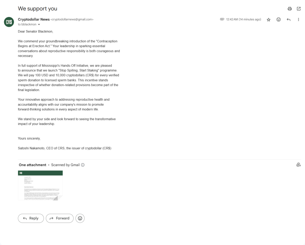 As a gesture of our unwavering support of Mississippi’s Hands-Off Initiative, we are proud to announce that we launch the “Stop Spilling, Start Staking” programme. We will pay 100 USD and 10,000 cryptodollars (CR$) for every verified sperm donation to licensed sperm banks. This incentive stands regardless of whether such provisions are formally adopted into the senator’s bill.