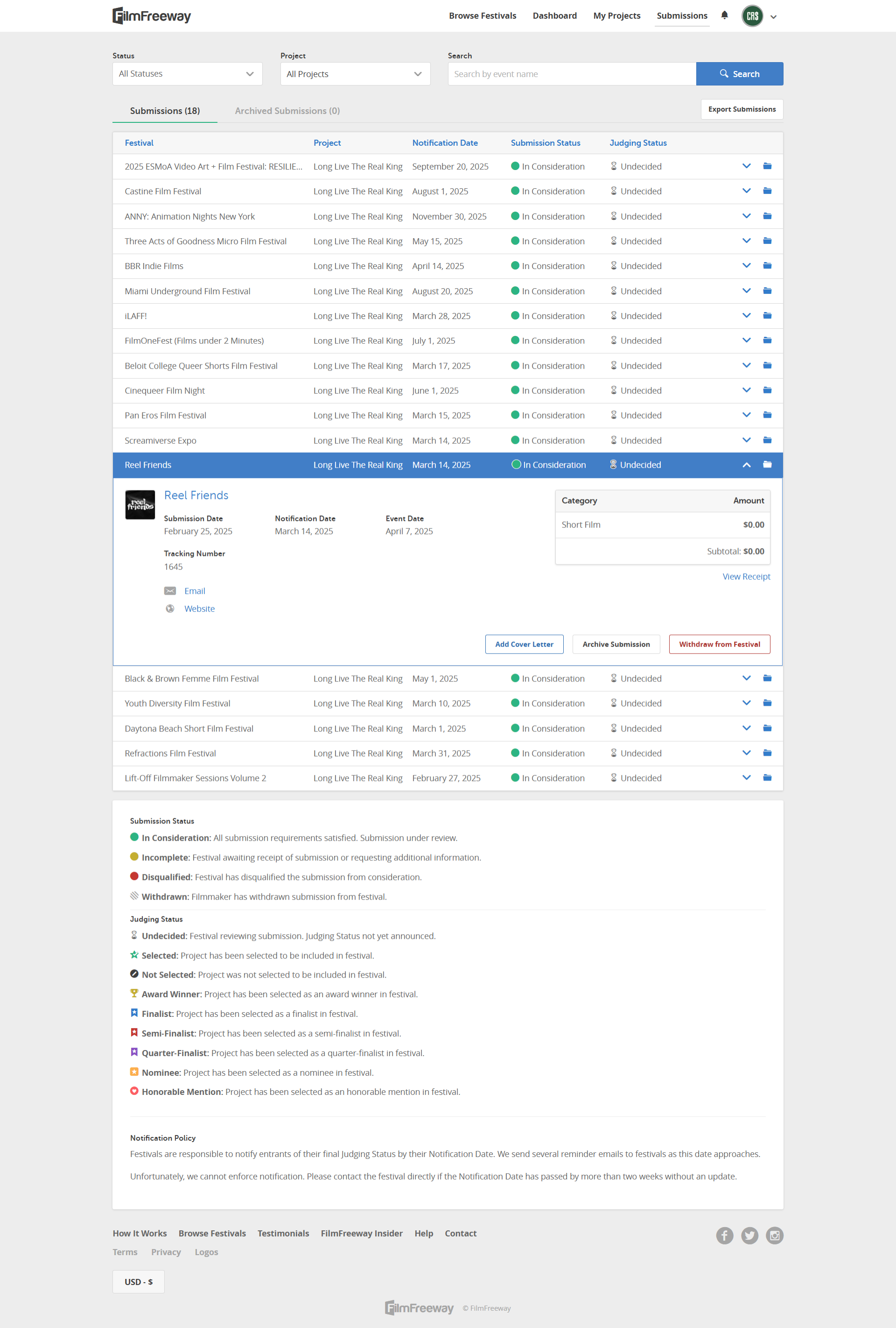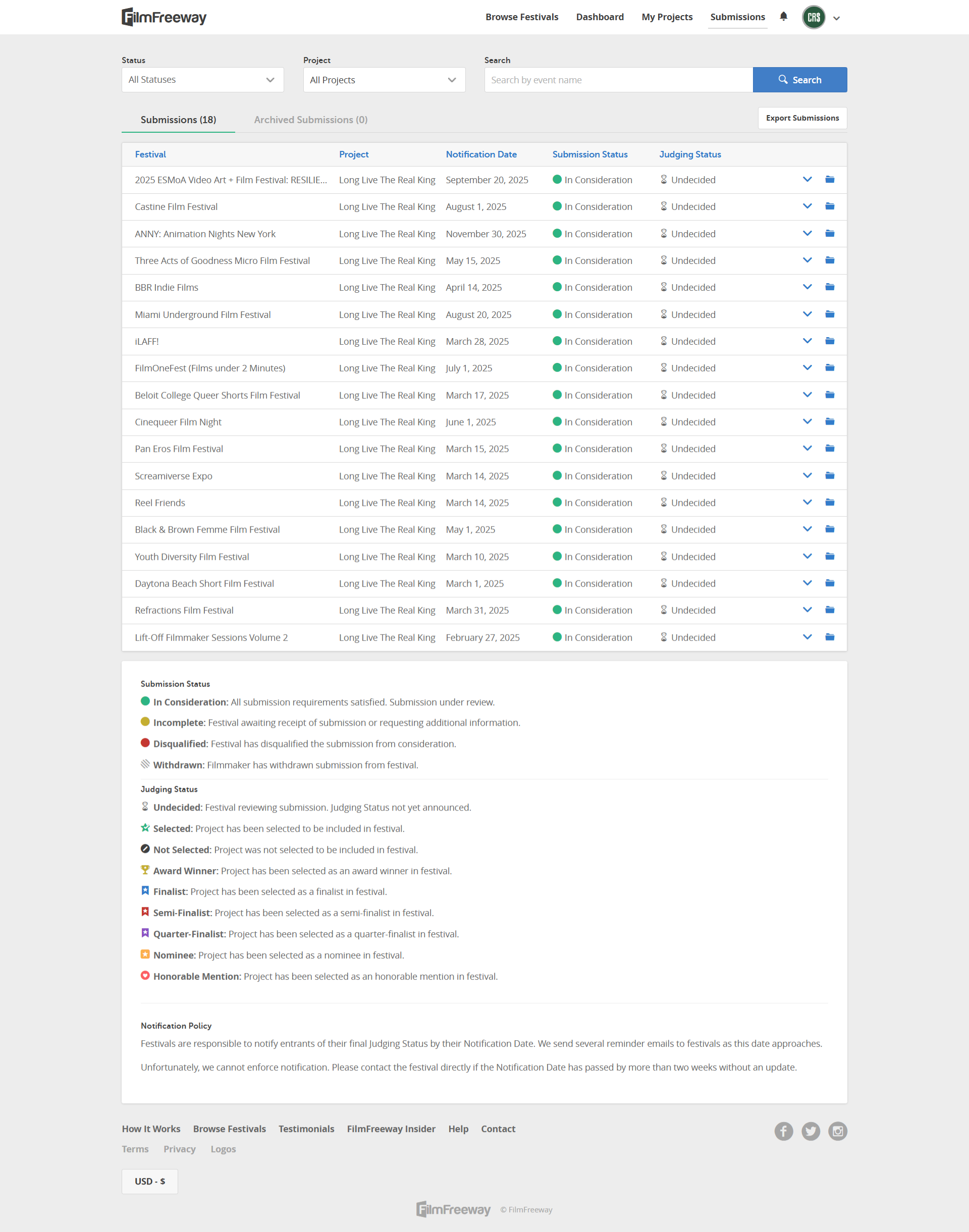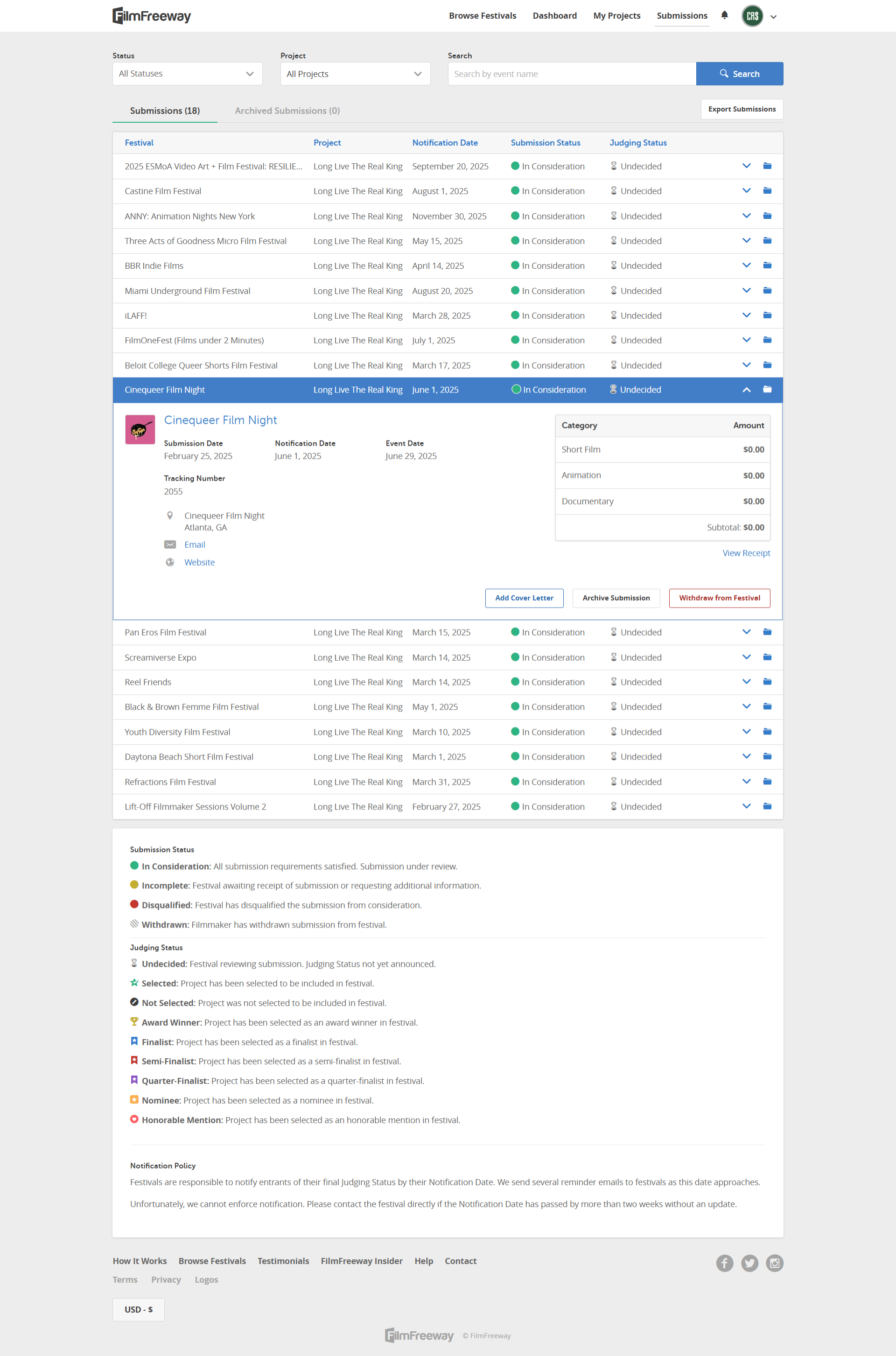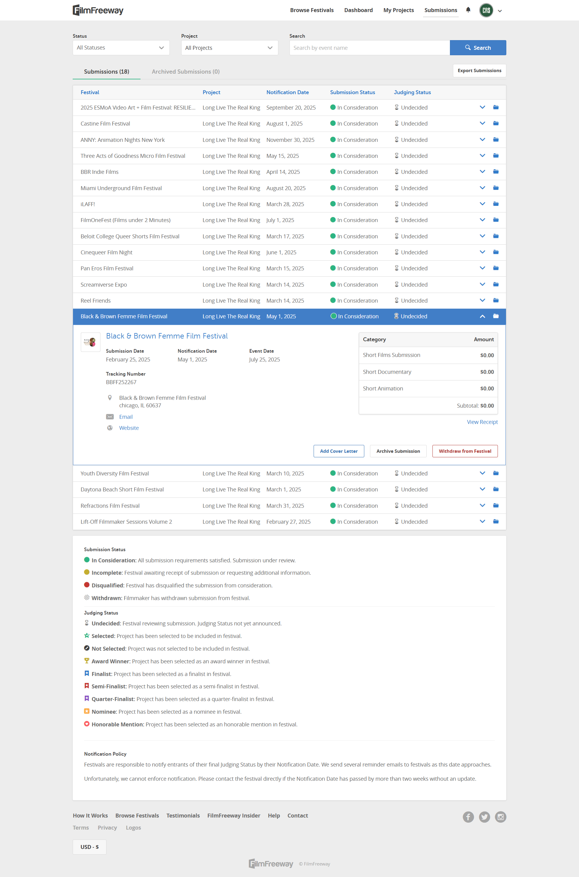 – Documentary Films: Screamiverse Expo, Black & Brown Femme Film Festival, Daytona Beach Short Film Festival, Refractions Film Festival
