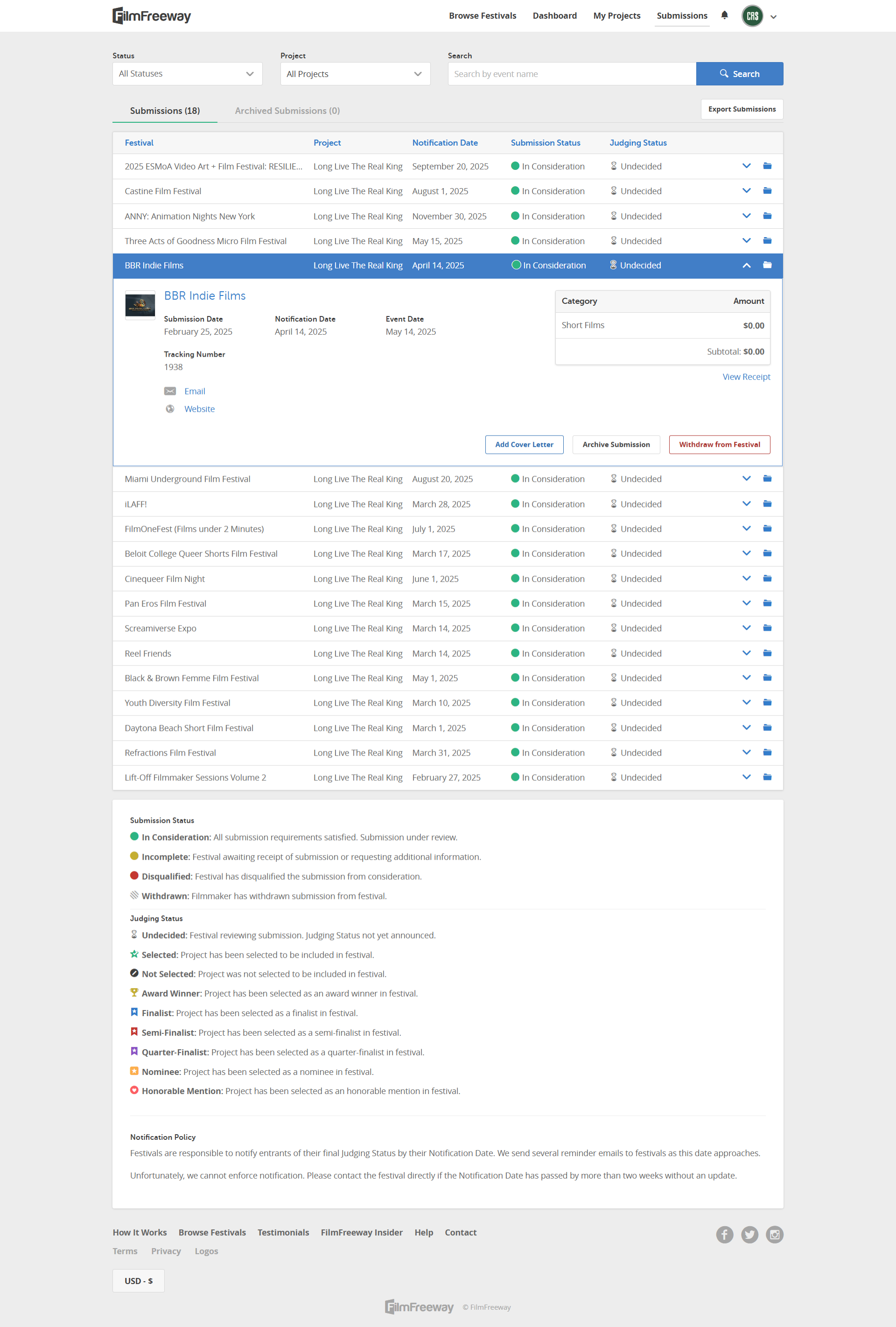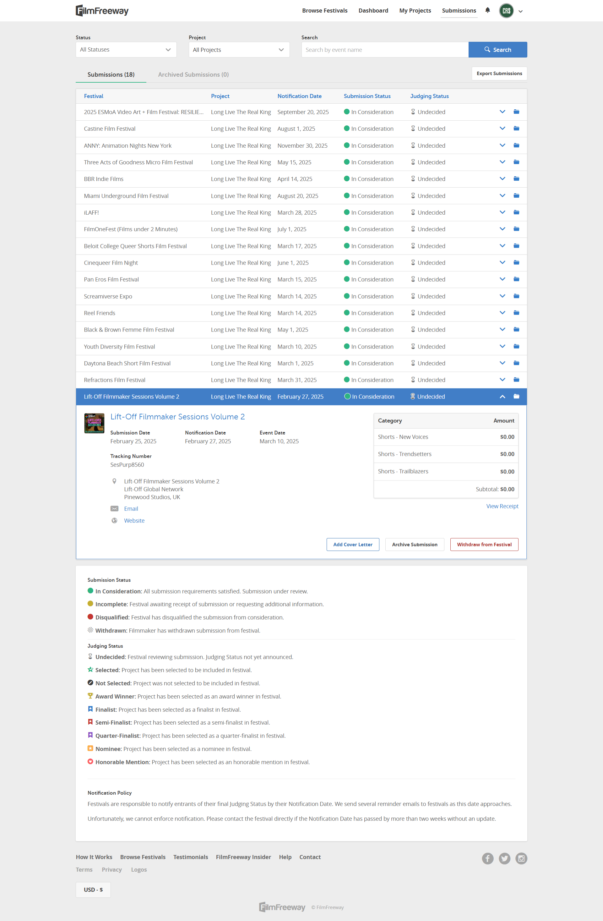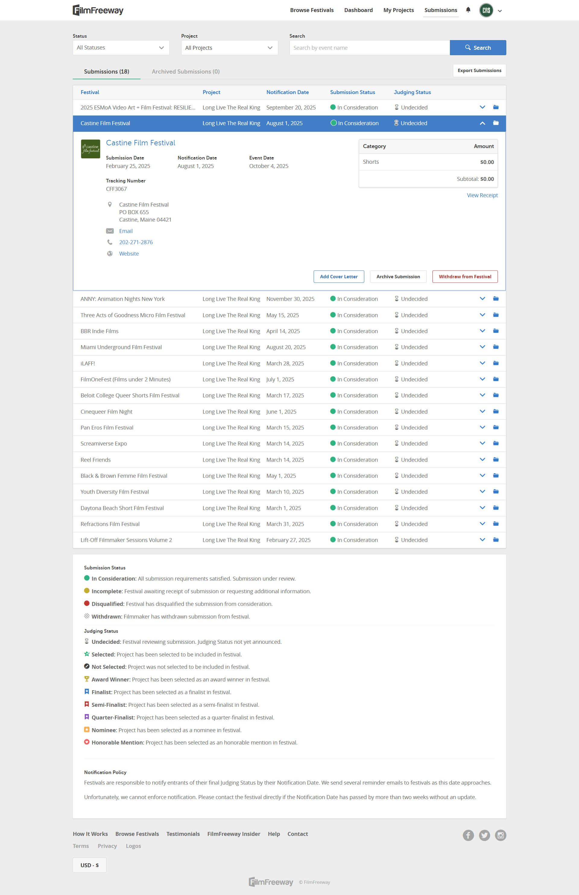 – Short Films: Castine Film Festival, Three Acts of Goodness Micro Film Festival, BBR Indie Films, Miami Underground Film Festival, Reel Friends, Youth Diversity Film Festival, Lift-Off Filmmaker Sessions Volume 2