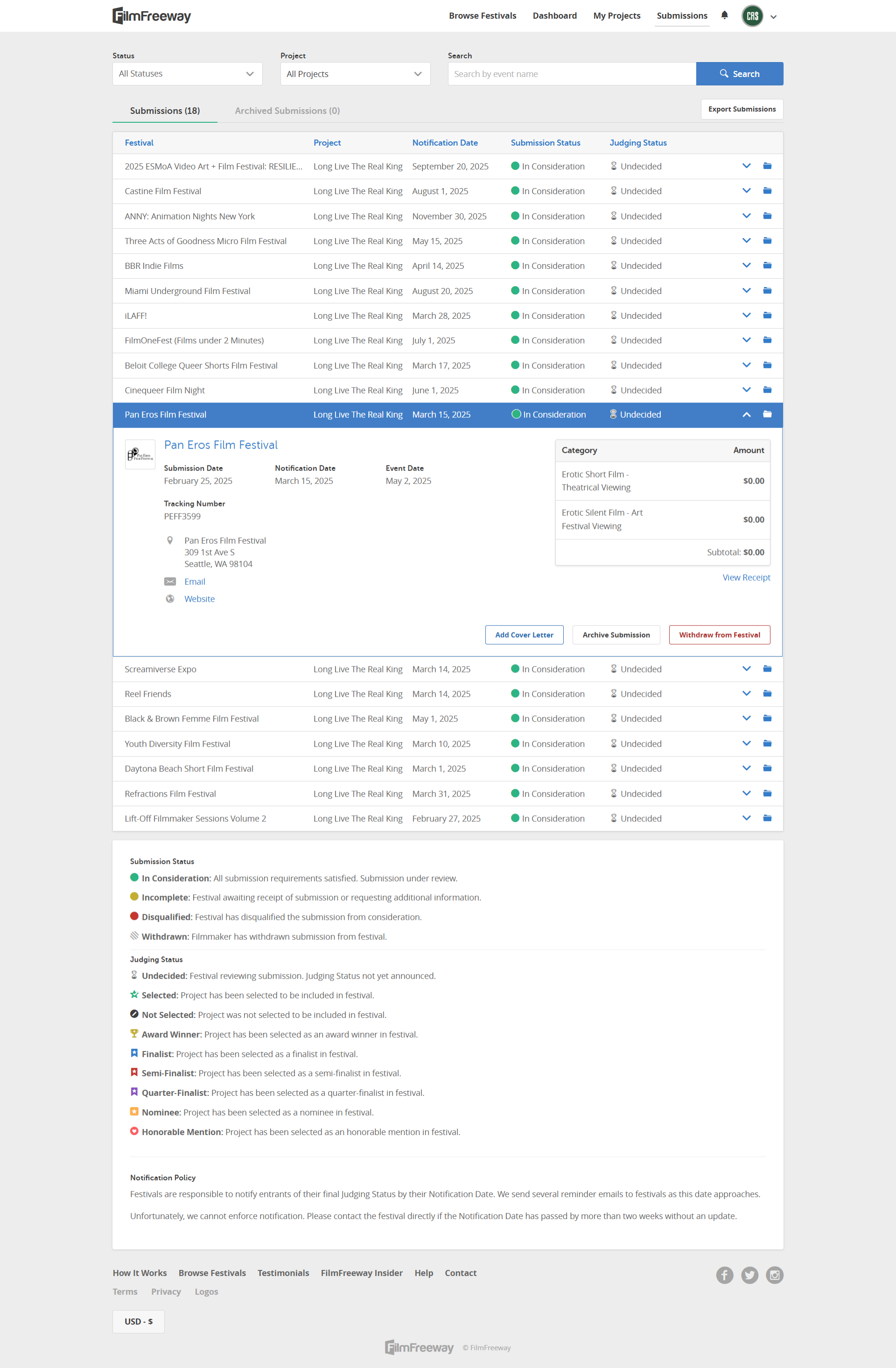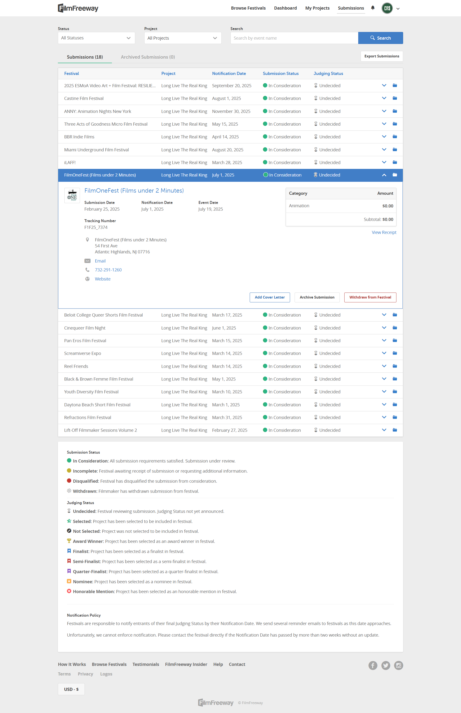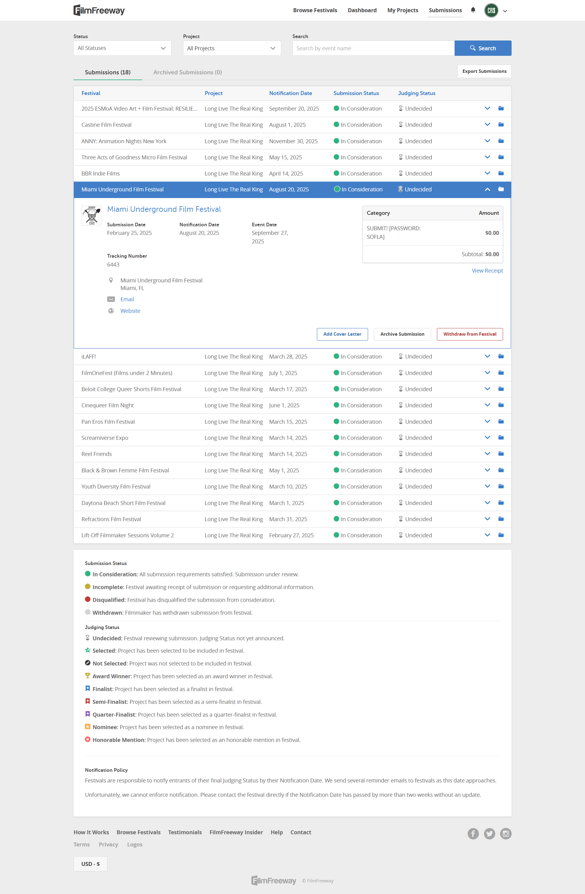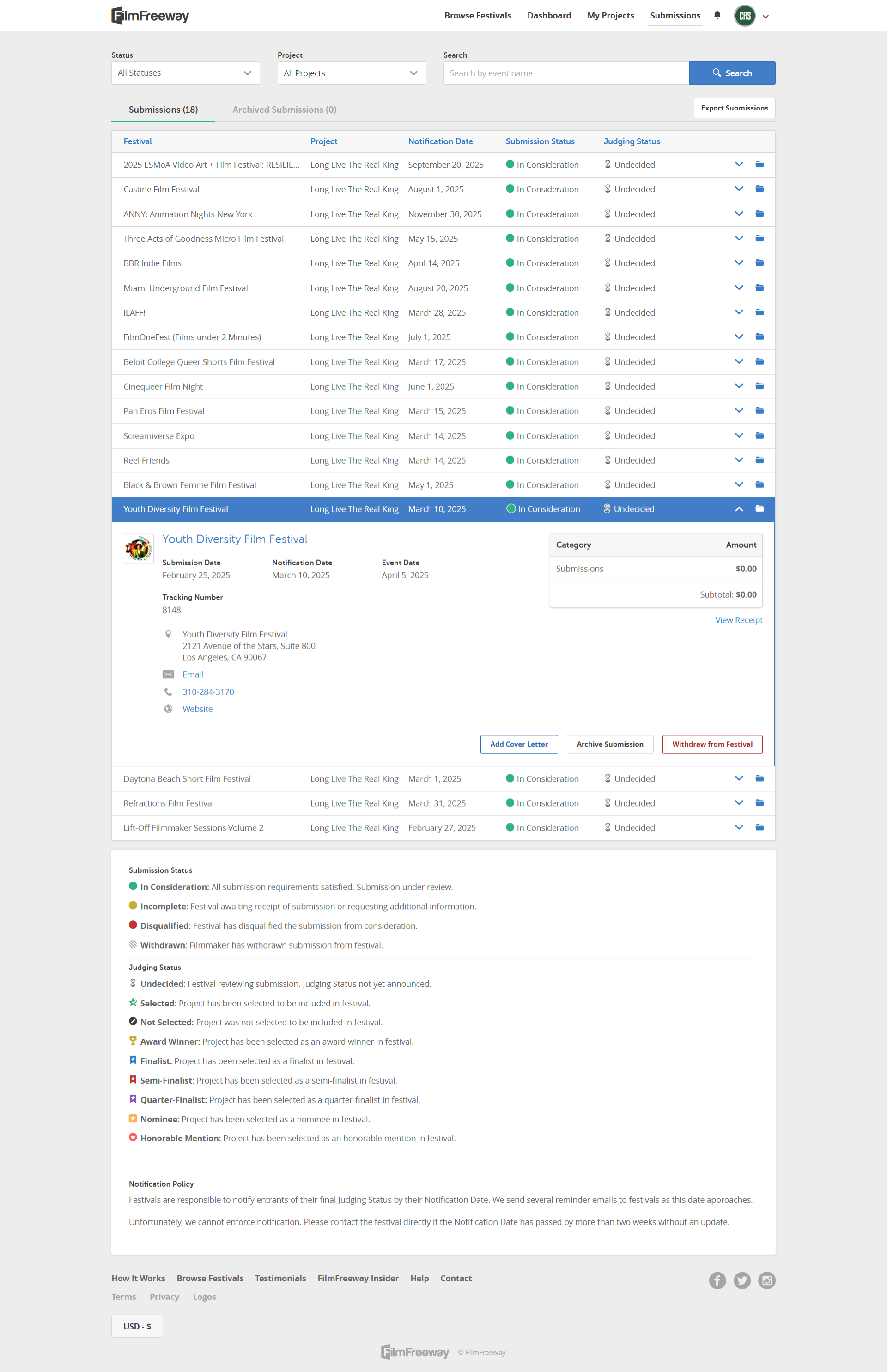 – Short Films: Castine Film Festival, Three Acts of Goodness Micro Film Festival, BBR Indie Films, Miami Underground Film Festival, Reel Friends, Youth Diversity Film Festival, Lift-Off Filmmaker Sessions Volume 2